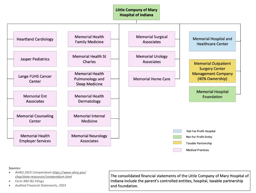 In 2023, the Memorial Hospital and Health Care Center in Jasper, Indiana, was a single hospital within the Little Company of Mary Hospital of Indiana – a health system. However, according to the Agency for Healthcare Research and Quality’s (AHRQ) Compendium of U. S. Health Systems, 2023, the system also included 15 medical practices, an outpatient surgery center management company, and a foundation. (See the organizational chart below.)